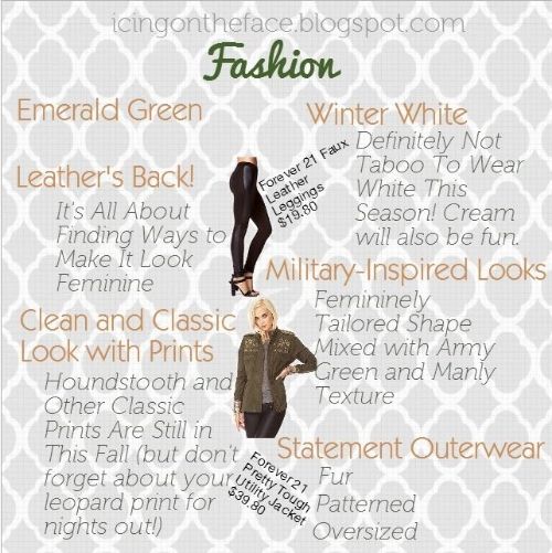 This is the last post in my Autumn Beauty Trends Series! I just have a quick overview of what I think is going to be biggest this fall. Military and Leather are going to be some of the trendiest things we see on the streets. I think I'm most excited for adding white into my Fall and Winter wardrobe in a way that works; it really brightens up all of the dark looks we usually see in cooler seasons.